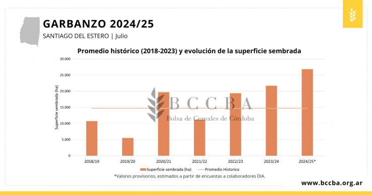 Según el último relevamiento de la Bolsa de Cereales de Córdoba (BCCBA) se espera la mayor superficie sembrada con garbanzo de las últimas seis campañas. El principal motivo de la decisión de siembra fue la humedad inicial del perfil, seguido por el precio del garbanzo y la rentabilidad esperada del cultivo.