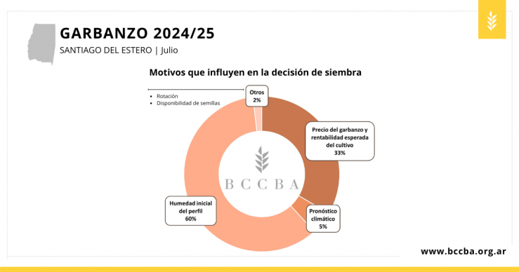El principal motivo de la decisión de siembra fue la humedad inicial del perfil, seguido por el precio del garbanzo y la rentabilidad esperada del cultivo.